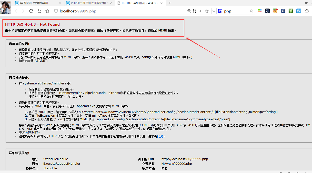 系统安装iis和phpstudy后,浏览网页就出现这样的错误:HTTP 错误 404.3 - Not Found