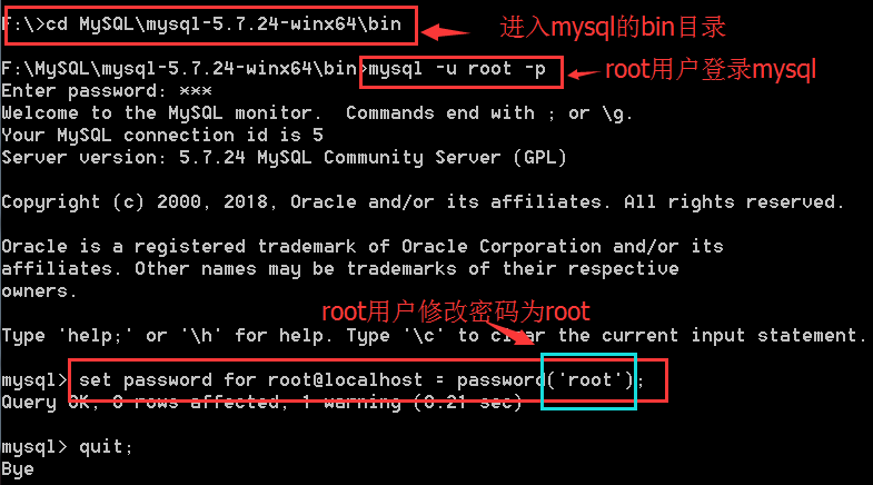 1、打开cmd进入MySQL的bin目录;(如我的路径是F:\MySQL\mysql-5.7.24-winx64\bin)